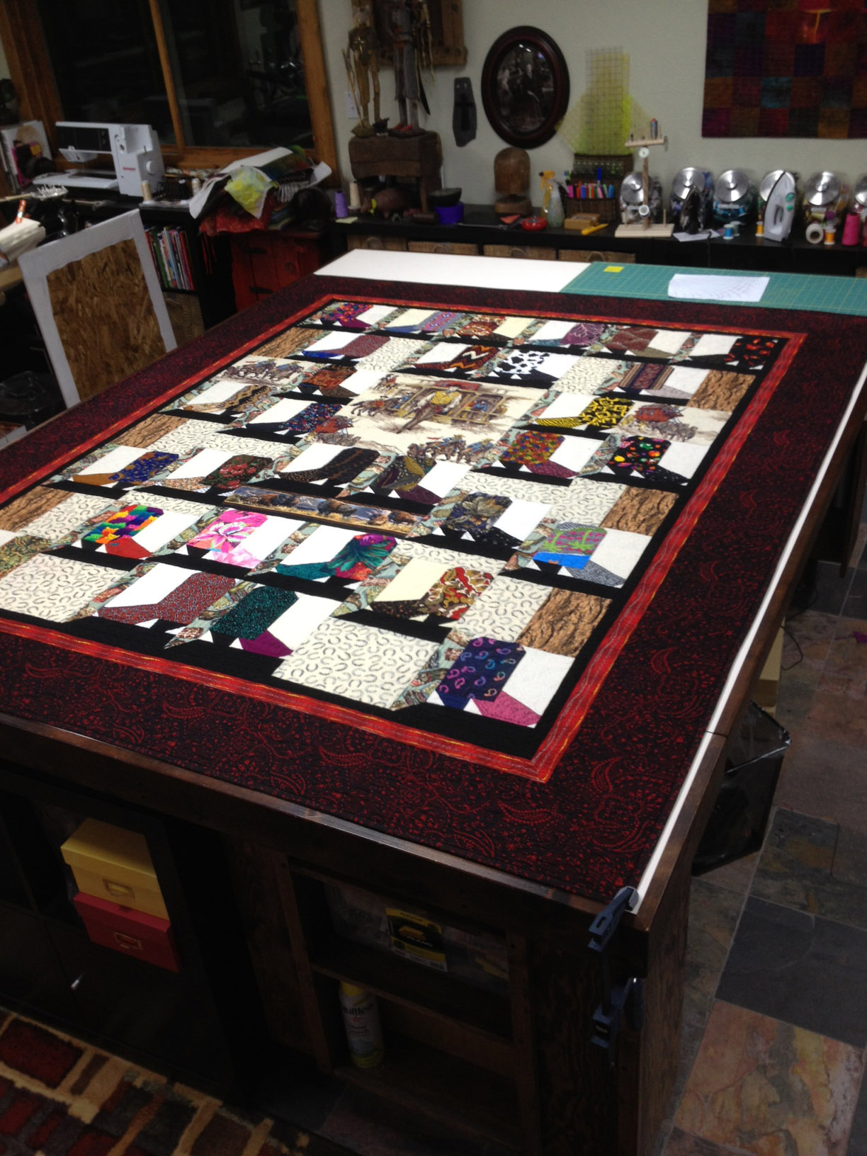 Last night I laid it out on my sewing table - wet and stretched for blocking it square. I finished the piped binding earlier in the day and now all that is left is a sleeve and label.
