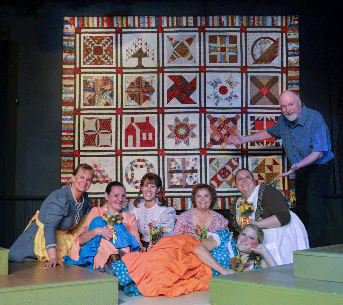 In 2015, the theater company in our little village of La Veta, Colorado decided to put on a production of The Quilters, a musical that depicted the lives of several pioneer women and the vignettes, or small stories, were inspired by traditional quilt blocks. Blocks are used in the play, and at the end, the finished Legacy quilt is revealed on stage. Our stage is somewhat small, so the quilt had to be created horizontally. I designed the quilt using the blocks listed in the play and members of the Colorado Quilt Council (our state guild) made two of each of the blocks. One for the stage - and one for the quilt. Cyndi McChesney quilted this quilt which was raffled off and the proceeds went to the our theater company. It was a fun project and the play was well attended in our community. Did you know? I have the pattens for these blocks on my website - free to all. CHECK IT OUT. One of my high school cohorts, Connie Ryle Newman, is deeply involved with the Laura Ingalls Wilder Legacy and Research association. She provided commentary and snippets from Wilder’s writings to compliment this project. You’ll find those on the Legacy Quilt Club page too. TRY THE JIGSAW PUZZLE Choose your own difficulty. Click the 9-patch grid to change number of pieces. Click the circle arrow to make the puzzle pieces rotating instead of stable orientation. Also, there are tips under the "?" on the upper right of the puzzle. If you'd like a full screen version, click the button below. Have fun! |