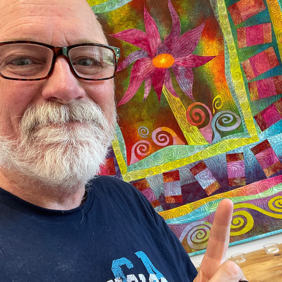Pink Flower Prelude is one of the more complex caveman quilts I’ve done. It is important to mention that the center of the flower is appliquéd on with the heavy stitching - that part is not pieced. Also, the scrolls that you see in the border and on the bottom of the center are also appliqué. There is bobbin quilting as well. That means, the quilt is turned upside down and the thread, a sparkly heavy thread that doesn’t work in the needle, is in the bobbin and a regular thread in the top. I love this bobbin quilting process.