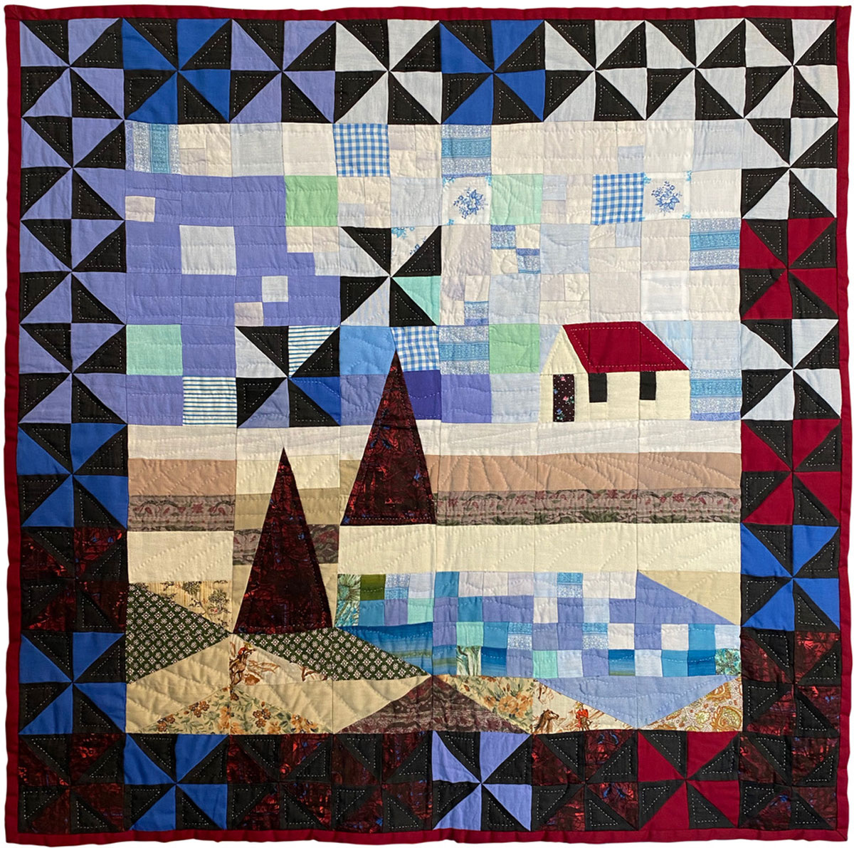 Somewhere I had read about creating a pictorial quilt by using traditional blocks and maybe one or two theme blocks. I sketched out a design on grid paper that included the old red-roofed farmhouse and used the pinwheel blocks to represent the windmills on the farm. I used my grandmother’s scraps to make the quilt. To this day, I love this quilt—and I love looking at the prints in this quilt. The cowboy and horse fabric are a favorite, but there was not much of it. The dark burgundy print was once, without doubt, one of Grandmother’s dresses. I hand quilted the quilt as I hadn’t really delved into machine quilting at this point. It was my first attempt at creating quilting textures. These were meant to enhance the furrows in fields and the wind blowing through the windmills.