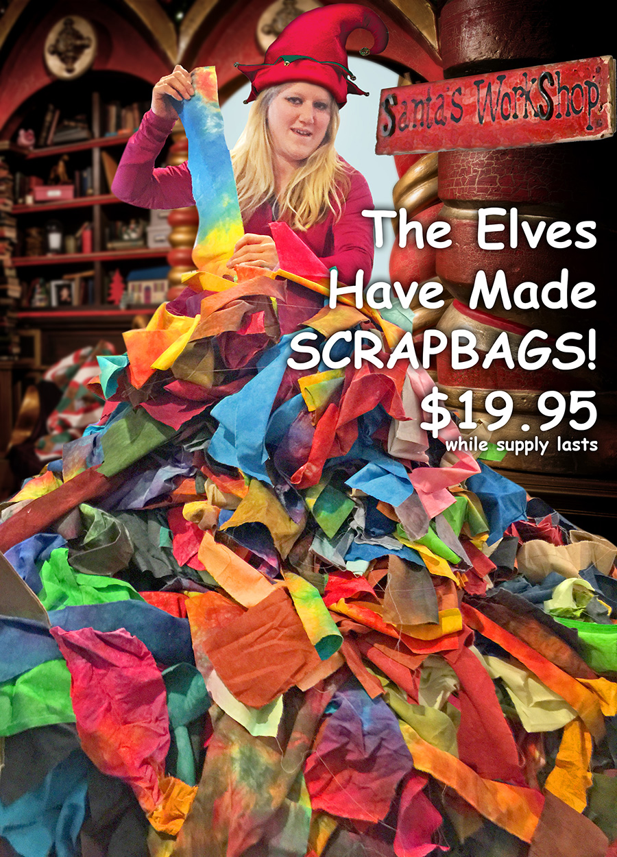 They're here again! Santa's elf (aka Heather, our warehouse genie) has been creating scrap bags from Ricky's hand-dyed fabrics. Get yours today! Give it as a gift!